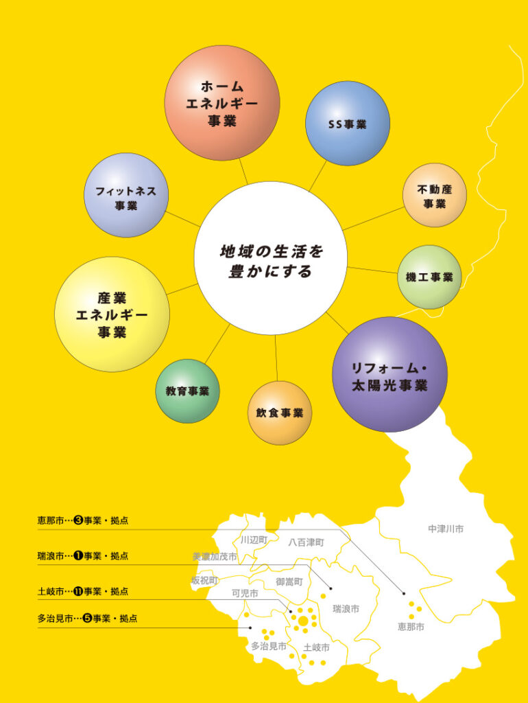 岐阜県東濃エリアを中心に、LPガスやガソリンといった産業や生活になくてはならないエネルギーを、90年にわたりお届けしている石黒商事。住宅リフォーム事業やコメダ珈琲店、女性だけの30分健康体操教室カーブスといった多彩な事業を展開し、教育事業などの新事業にも挑戦しています。一見、関連性がない事業に思われるかもしれませんが、すべての根底にあるのは、「地域を豊かにしたい」という想いです。地域のあらゆる方々が必要とするものを扱ってきた身近な商社として、事業を通じ地域社会、お客様に貢献し続ける。そんな視点で、この街を笑顔にする商品・サービスを提供しています。